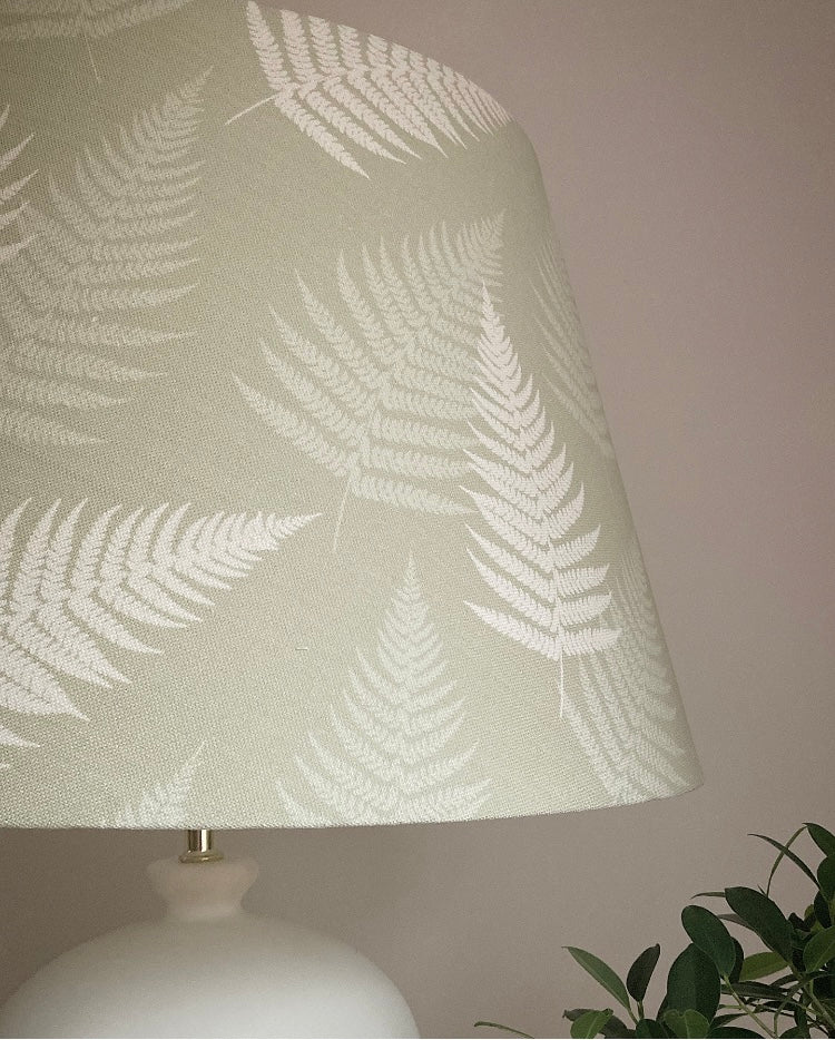 Photographed is a beautiful custom tapered drum-shaped lampshade, covered by hand with this stunning Meg Morton pure linen fabric featuring Thorncombe Ferns on soft moss. Other colorways available.