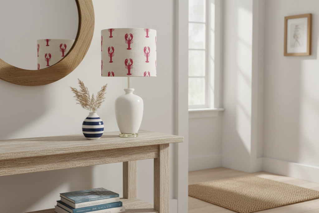 A beautiful round drum-shaped lampshade, covered by hand with this stunning Peony & Sage pure linen fabric featuring Red Lobsters on a Stone colored background.