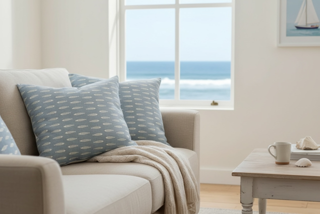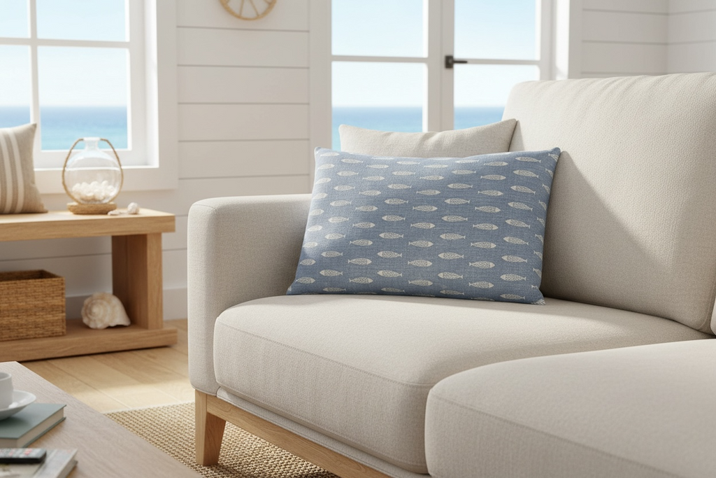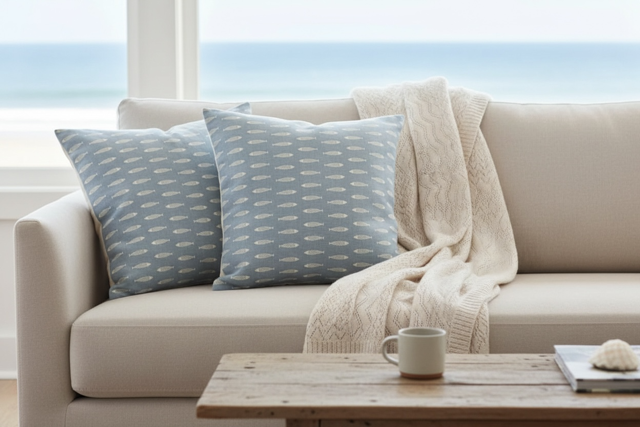 A beautiful pillow in Peony & Sage Pez Fish, weathered blue on chunky cream.