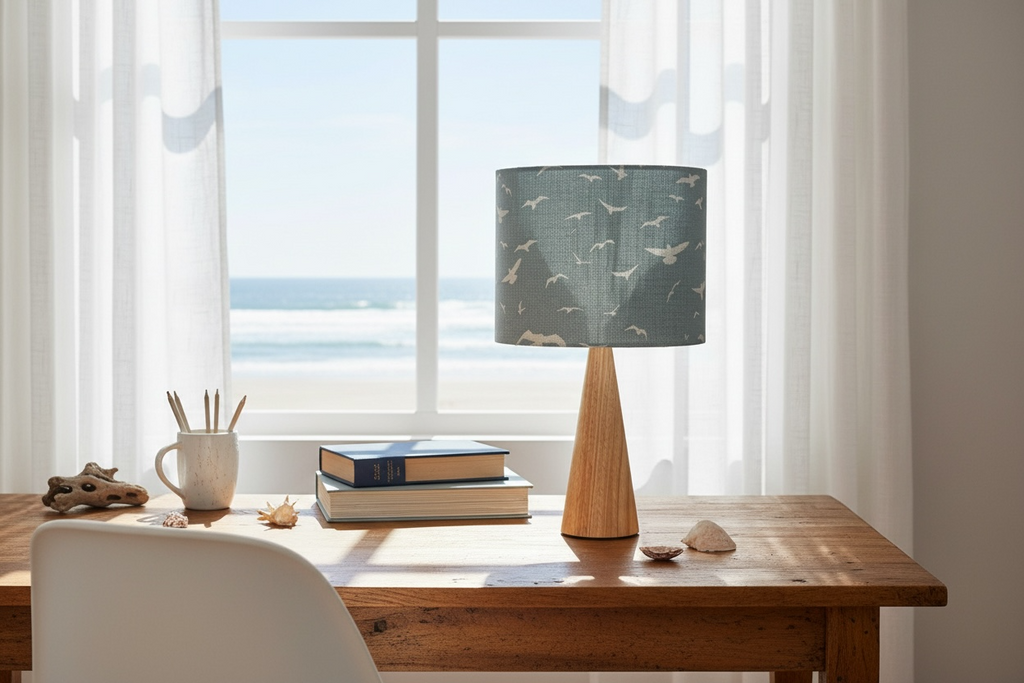 Featuring a handcrafted 8 inch diameter x 6.5inch height linen lampshade on a hand-turned wooden base, the lamp stands at just 14inches tall for a compact, timeless look